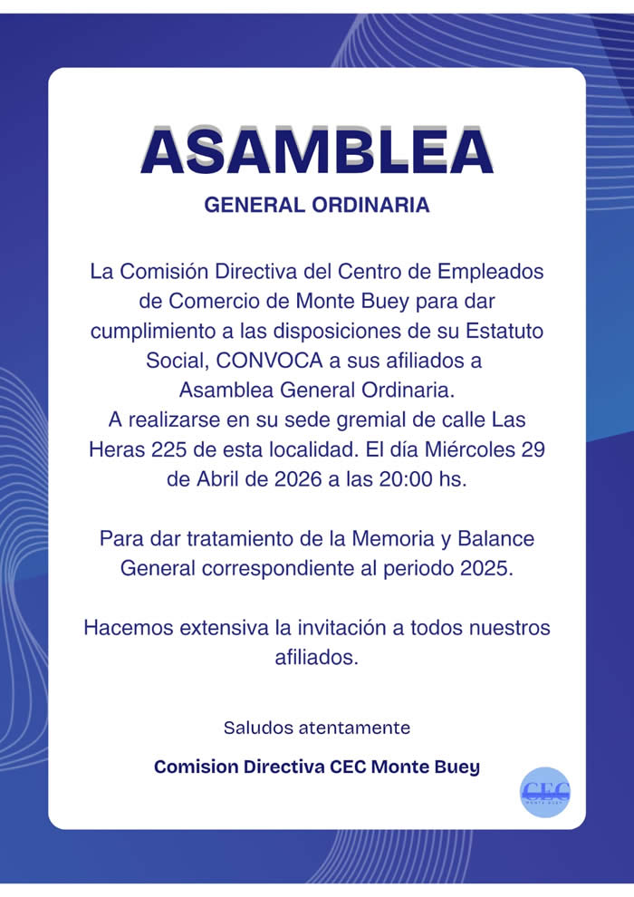 El día miércoles 29 de abril de 2026 a las 20:00 hs., en la sede gremial de calle Las Heras 225 de Monte Buey, Asamblea General Ordinaria.